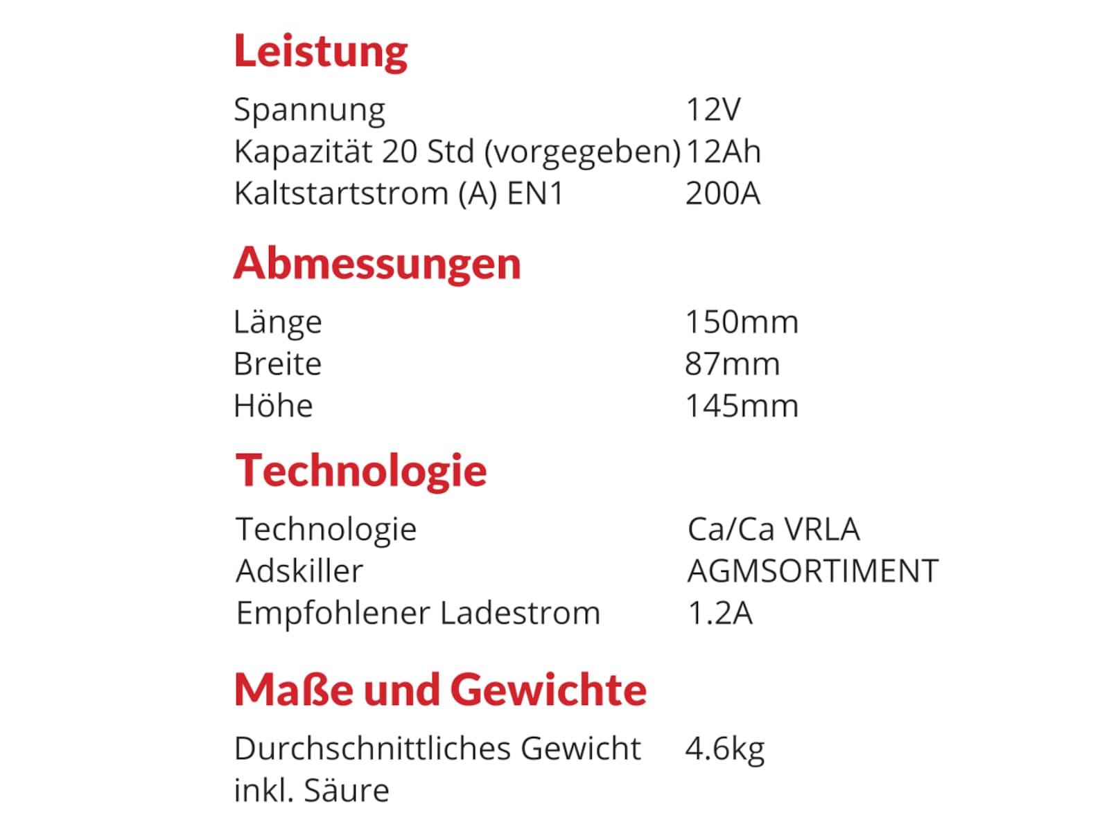Spannung: 12V Kapazität (20hr): 12Ah Kaltstartfähigkeit (A) EN1: 200 Schaltung: 1 Pluspol links [+/-] Anschluss: Quaderpol FT-M6 von vorne oder von oben geschraubt Empfohlene Laderate (Amp): 1.4 Maße in mm (LxBxH) 150x87x145